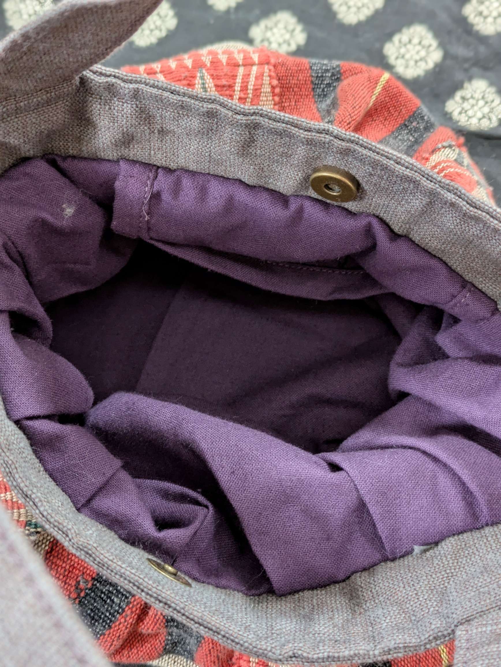 持ち手の部分は茶色で裏地は紫色です。
